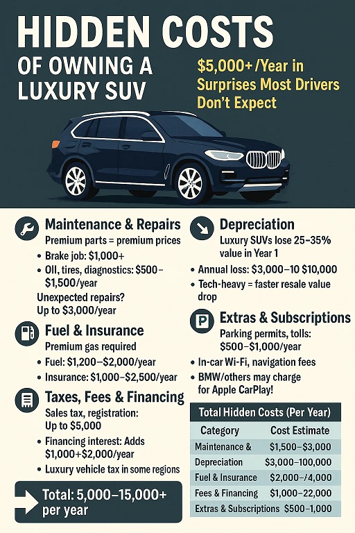 Luxury SUVs are tempting, but the hidden costs—repairs, value loss, gas, and fees—can add $5,000–$15,000 to your yearly expenses. If you’re dreaming of that leather interior, run the numbers first. That smooth ride could come with a rocky price tag.